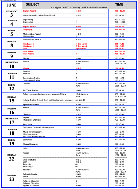 It’s an early LC this year, with the 2026 Leaving Cert beginning on Weds, June 3rd. Here’s the full timetable: